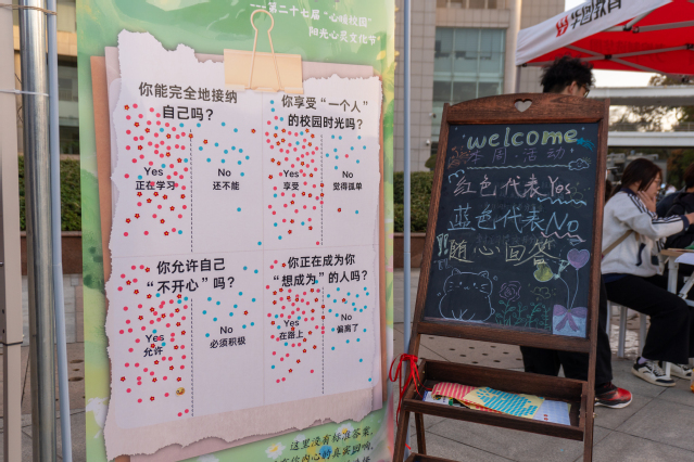 互动区以“‘镜’请提问,我心回答”为核心,同学们领取答案贴纸后,在问题板前遵从内心选择“YES”或“NO”并粘贴,完成与自我的坦诚对话。随着易拉宝上的贴纸逐渐增多,每一个独一无二的选择都彰显着不同的心理状态,让大家感受到被看见、被理解的温暖。领奖兑换区同样热闹,同学们攥着集满校院心协印章的卡片,集满8个印章即可兑换心仪小玩偶,集满贴纸更有机会冲击排名赢取文创大奖,收获的惊喜与欢笑被相机定格成专属记忆。