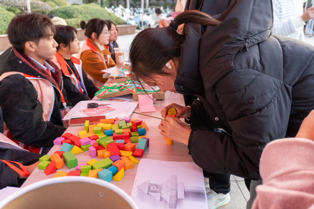 现场体验活动由校心协及各院心协精心策划组织,围绕主题划分游戏区、互动区、领奖区三大功能区域,打造沉浸式心灵治愈体验。游戏区作为核心体验板块,设置三条特色赛道,挑战与治愈兼具:“筑心之镜”环节中,同学们随机抽取样式卡与挑战卡,在规定时间内克服分心干扰、非惯用手操作等阻碍搭建“心灵塔”,在指尖实践中锤炼专注力与抗压能力;“心语轻体验”赛道聚焦自然疗愈,大家专注于叶脉与干花的手工搭配,在慢节奏创作中感受正念与平静,实现与自然的深度交融;“心动环游记”则汇集各学院心协筹备的趣味心理小游戏,让同学们在欢乐互动中释放压力、收获心理成长。